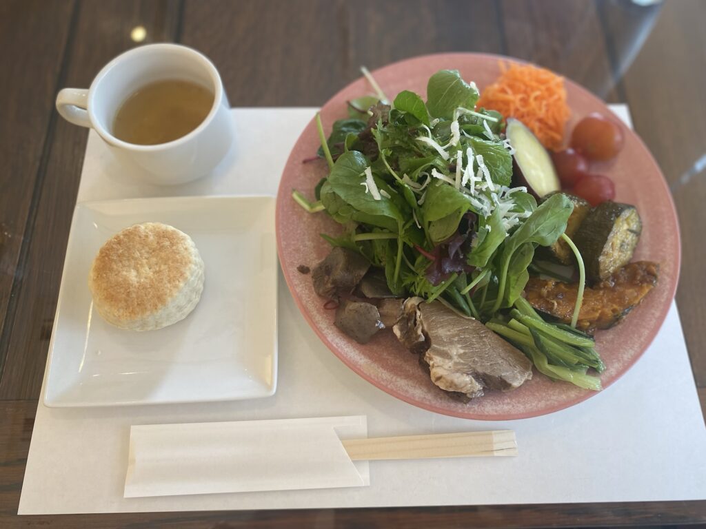 そしてたっぷりお野菜に少しお酢を効かせた焼き豚二切れついていて、ヘルシーながらバランスもいい。何よりいろんな野菜がおいしく食べれて大満足。男性にはものたりないだろうけど、女子には嬉しいランチ。
